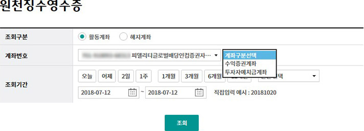 Step 1. 조회구분, 계좌번호를 선택한 후 조회버튼을 클릭합니다.