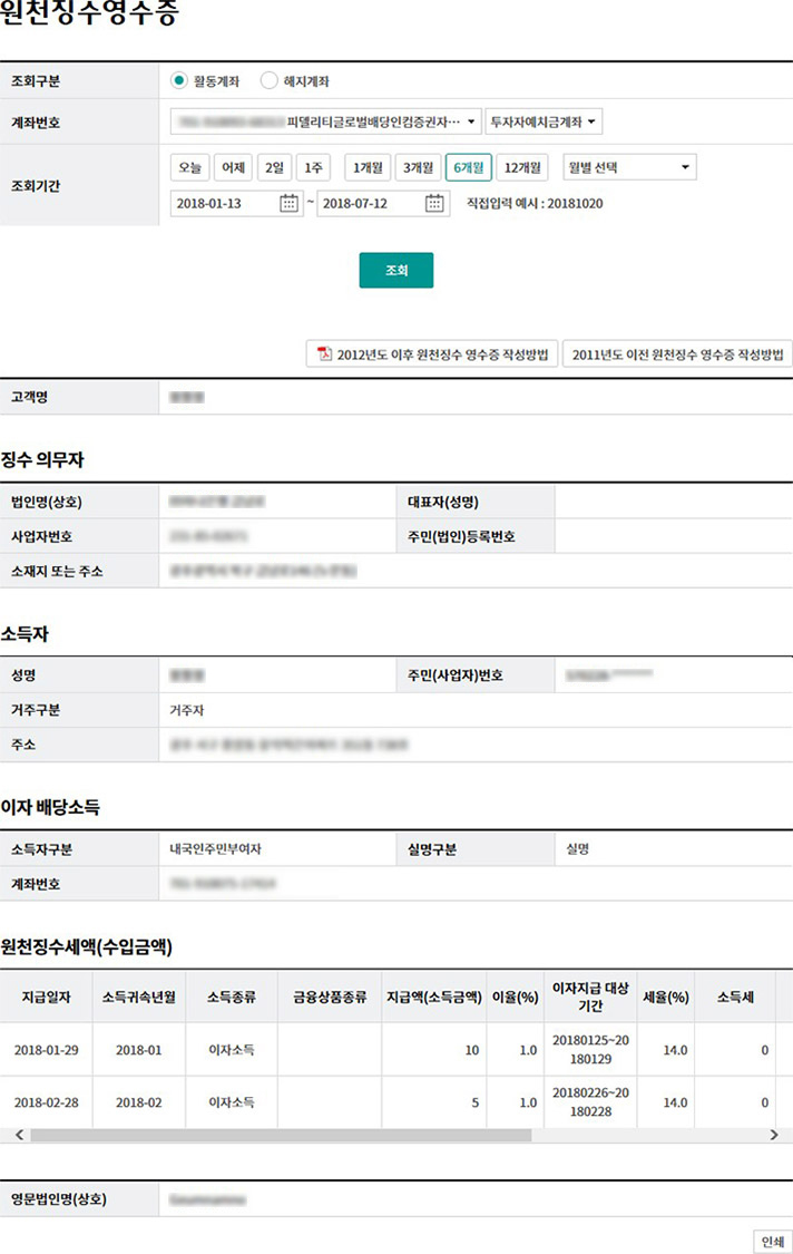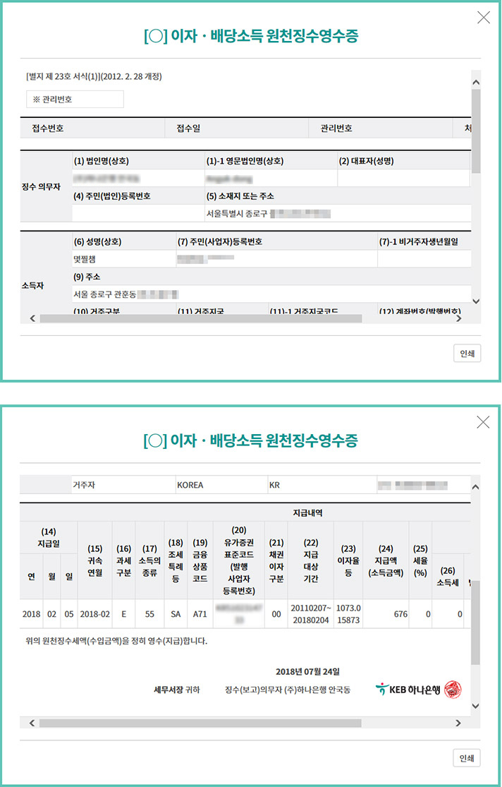 Step 2. 조회된 내용을 확인합니다. (출력을 원하실 경우 인쇄버튼을 클릭합니다.)