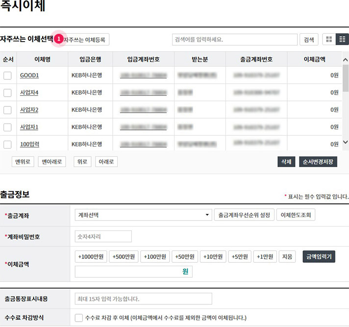 ① ‘자주쓰는 이체선택’을 통해 출금계좌, 입금계좌, 이체금액 등을 클릭 한번으로 투입이 가능합니다.