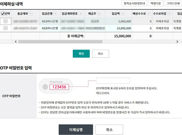 Step 3. 즉시이체 신청내용을 확인하신 후 OTP번호 및 인증서 암호를 입력합니다.