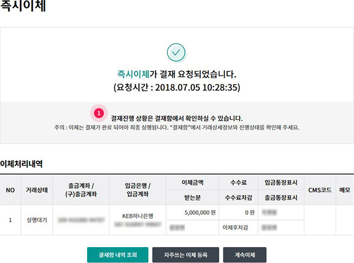 ① 결재사용자는 결재요청안내문구 출력되고, 결재미사용자는 이체결과안내문구 출력됩니다.