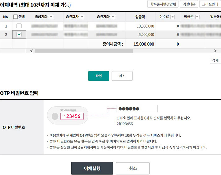 Step 2. 등록한 증권자금이체내역을 확인한 후 OTP 번호 및 인증서 암호를 입력합니다.