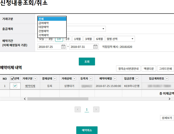 Step 1. 예약이체신청을 조회하거나 취소 할 수 있습니다.