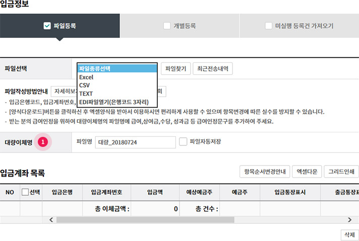 • ① 받는 분의 급여인정을 위해서는 파일명에 급여, 상여금, 수당, 성과금 등 급여인정문구를 추가해야 합니다. (Ex. 파일명: 대량_20170724 → 급여_20180724)