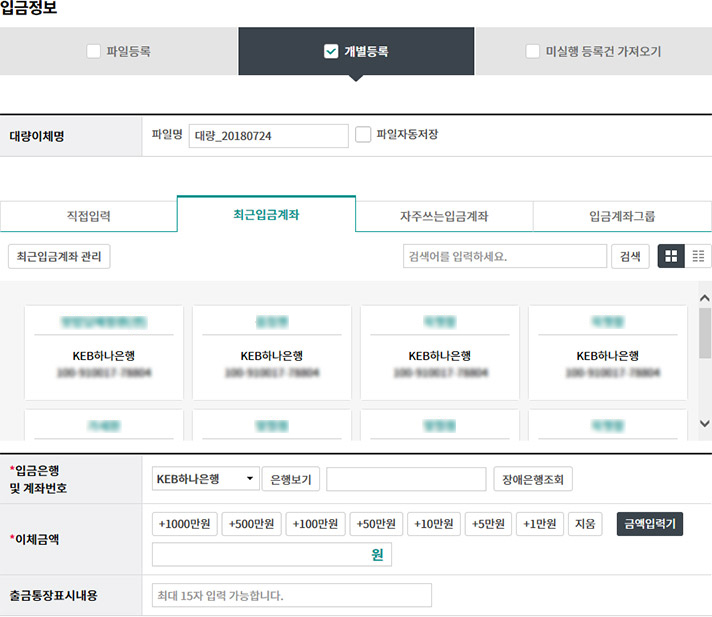 Step 2-1. 입금정보에서 개별등록을 선택할 수 있습니다.