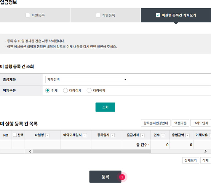 • ① 미 실행건 목록을 조회하여 등록할 수 있습니다.