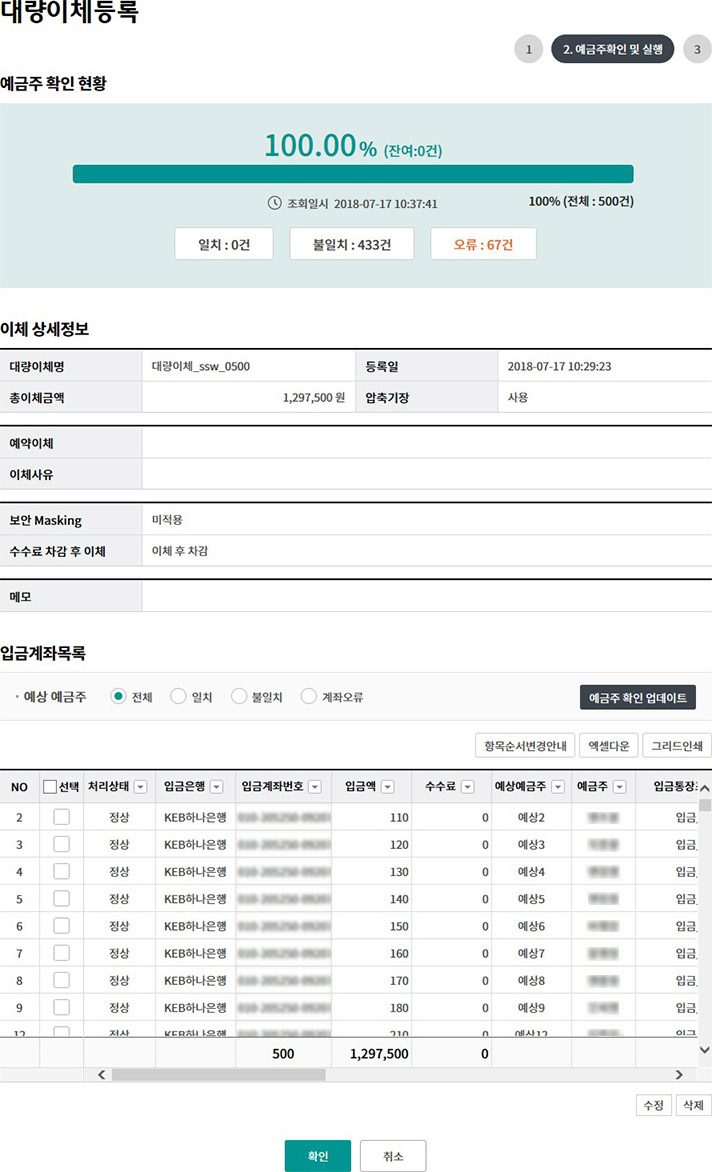 • ② 보안Masking적용여부 : [적용]을 선택하시면 작성한 아이디 외에는 이체금액을 조회할 수 없습니다. (예외ID 지정가능)