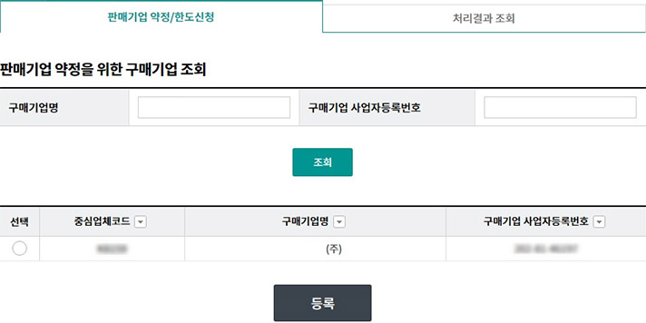 Step 1. 구매기업명 또는 사업자등록번호로 조회 후, 중심업체코드를 선택하여 등록 버튼을 클릭합니다.