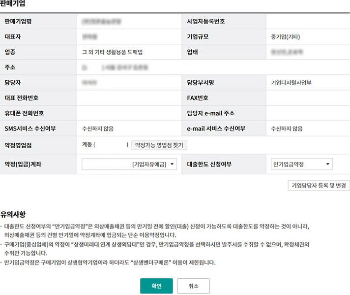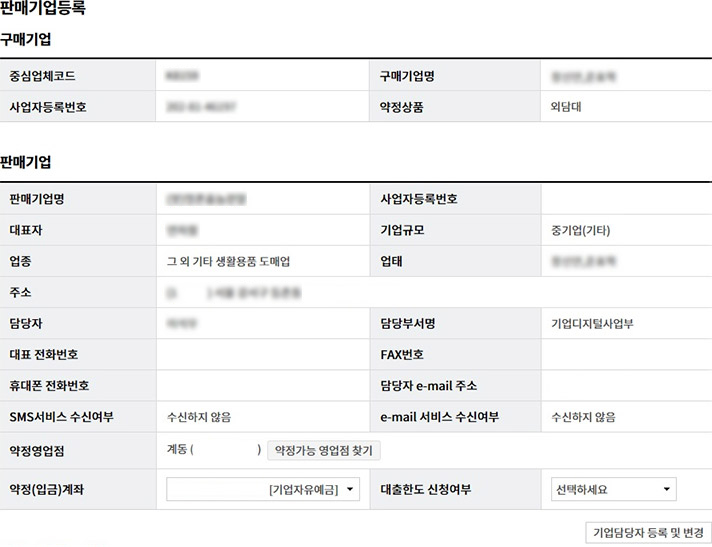 Step 3. ‘기업담당자 등록 및 변경’에 정보 투입 후 확인버튼을 클릭합니다.