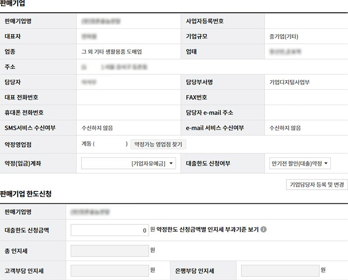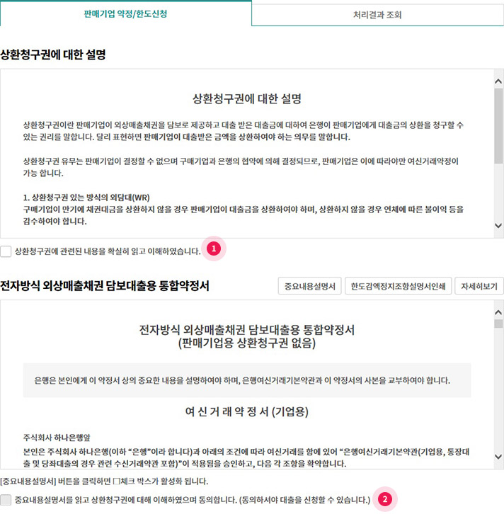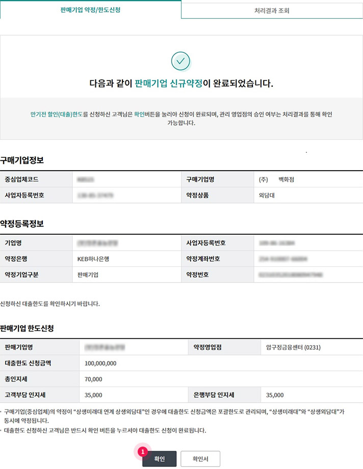 • ① 만기전 할인(대출)한도를 신청하신 경우 '확인'버튼 클릭시 처리결과 화면으로 연결됩니다.