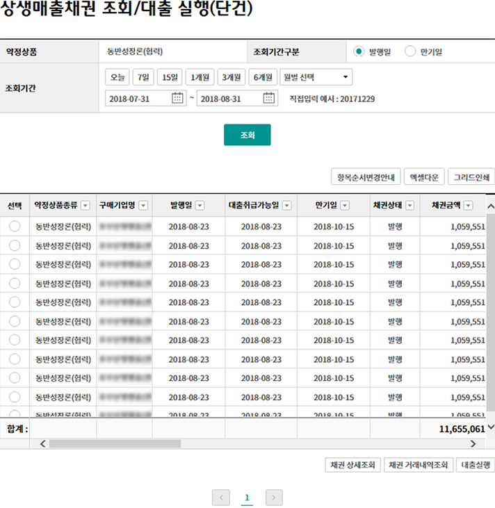 Step 1. 채권을 조회하여 채권선택 후 상세조회,거래내역조회,대출실행 버튼을 클릭합니다.