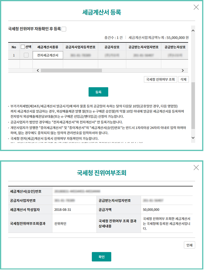 Step 5. 추가된 세금계산서의 국세청 진위여부를 확인합니다.