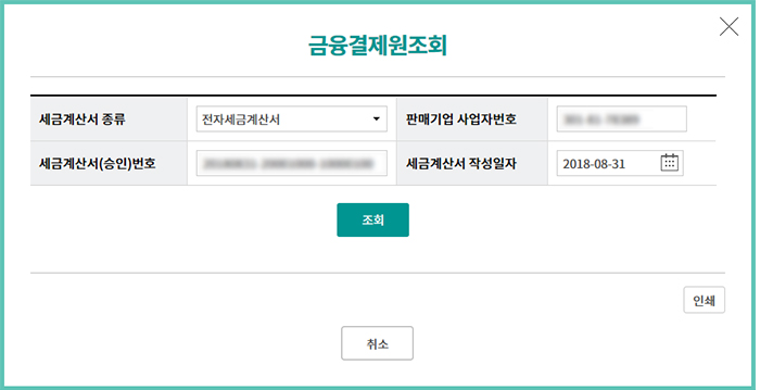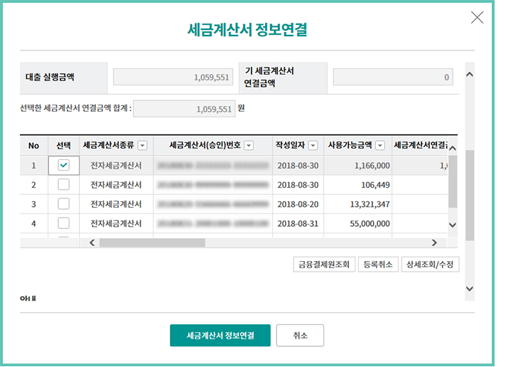 Step 7. 기 등록된 세금계산서를 선택한 후 금융결제원조회 버튼을 클릭합니다.