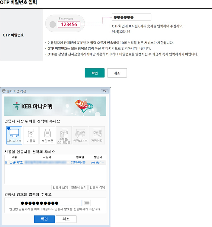 Step 10. OTP 비밀번호 및 인증서 암호를 입력합니다.