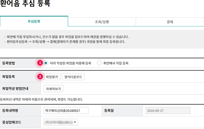 Step 1-1. 추심등록정보를 화면에 직접 등록하거나, 미리 작성된 파일을 등록합니다.