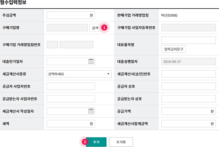 • ① 구매기업 확인을 위해 검색버튼을 눌러 구매기업명, 사업자번호, 거래영업점 번호를 확인합니다.