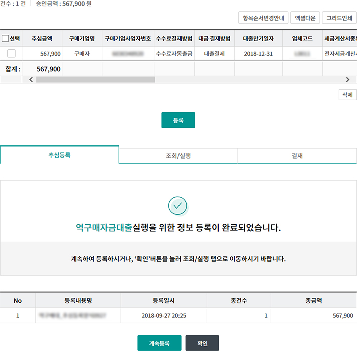 • 일괄구매자금대출 추심 등록/대금결제
