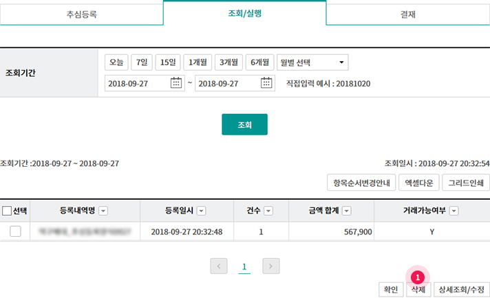 Step 1-3. 입력 완료 후 등록버튼을 클릭하여 조회/실행단계로 이동합니다.