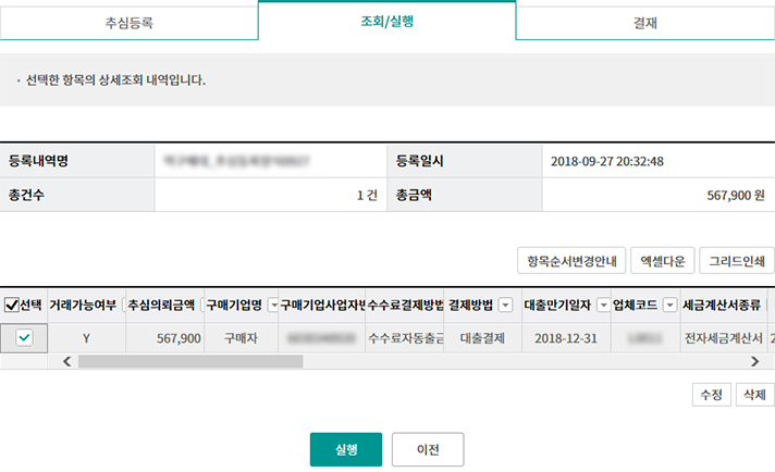 Step 2-2. 상세조회/수정버튼을 이용하여 등록내역을 확인하고 수정(필요 시) 합니다.