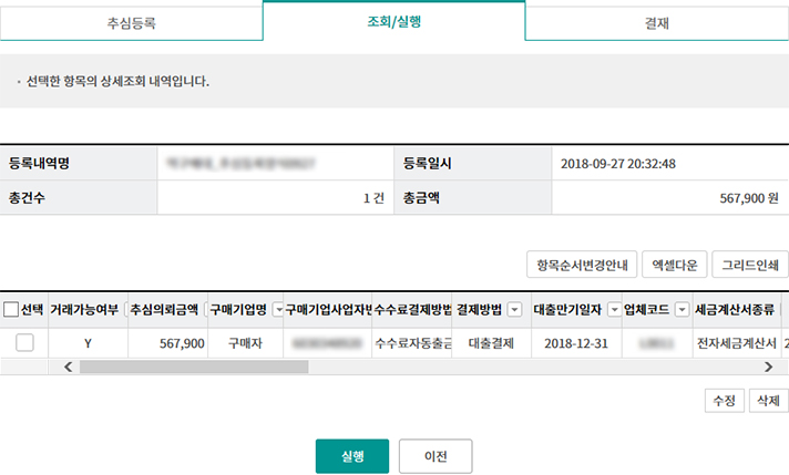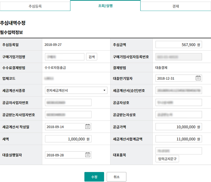 • 외상매출채권 조회/대출 실행(단건)