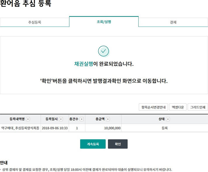 Step 2-5. 환어음 추심등록(실행) 완료 됩니다. (단독 사용자의 경우)