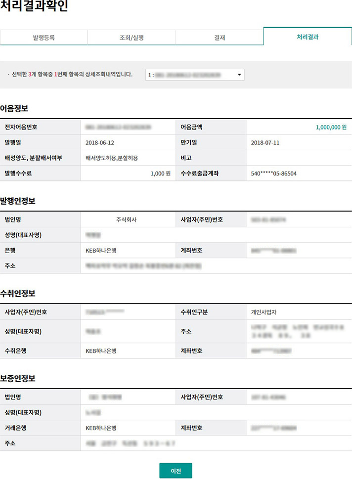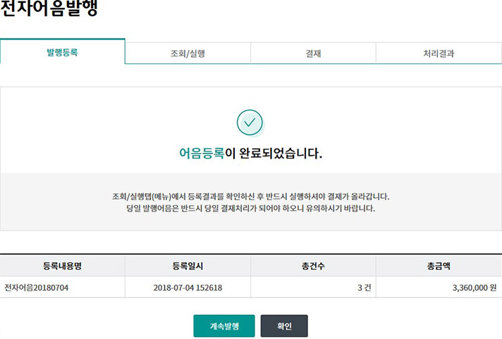 • ① 상위 결재자가 존재할 경우 결재요청이 완료되며, 단독사용자일 경우 전자어음 발행작업이 완료됩니다.
