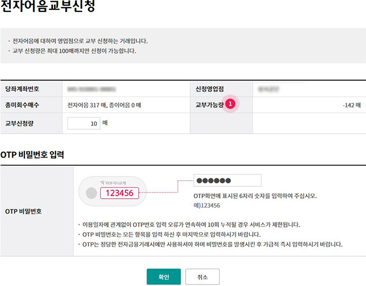 Step 2. 교부가능량을 확인하고 신청매수를 투입한 후 OTP번호와 인증서암호를 입력합니다.