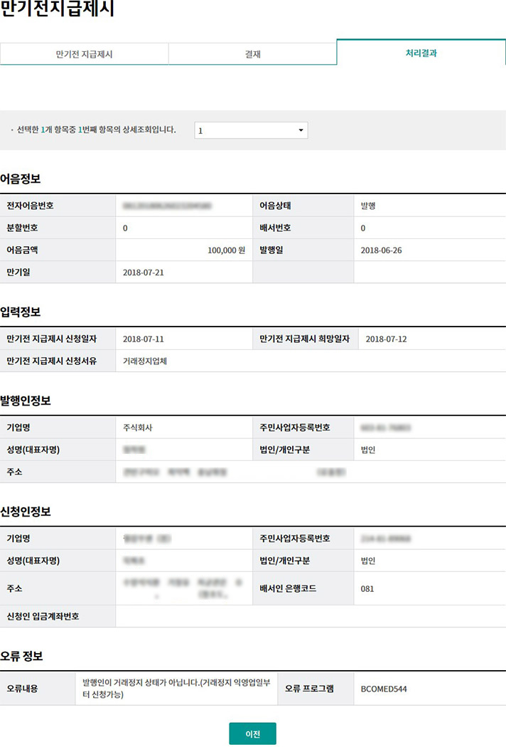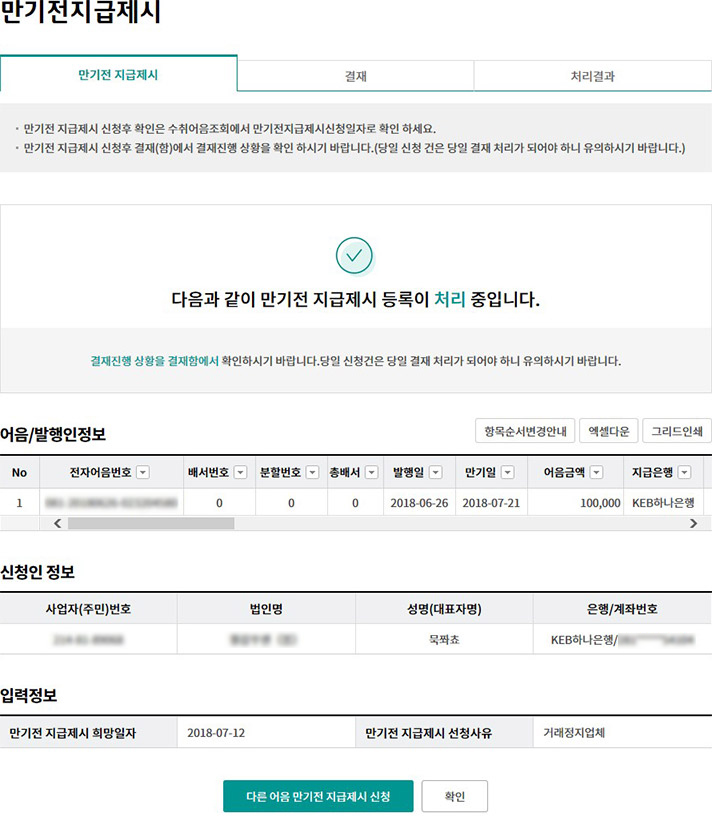 Step 5. 만기전 지급제시 등록완료화면 입니다.