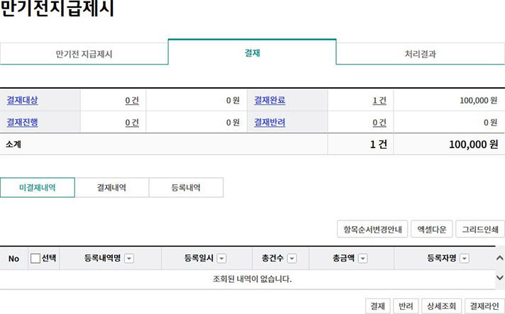 Step 6. 미결재내역, 결재내역, 등록내역 중 원하는 거래를 클릭합니다. (단독사용자 경우 해당사항 없음)
