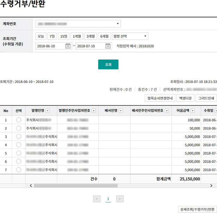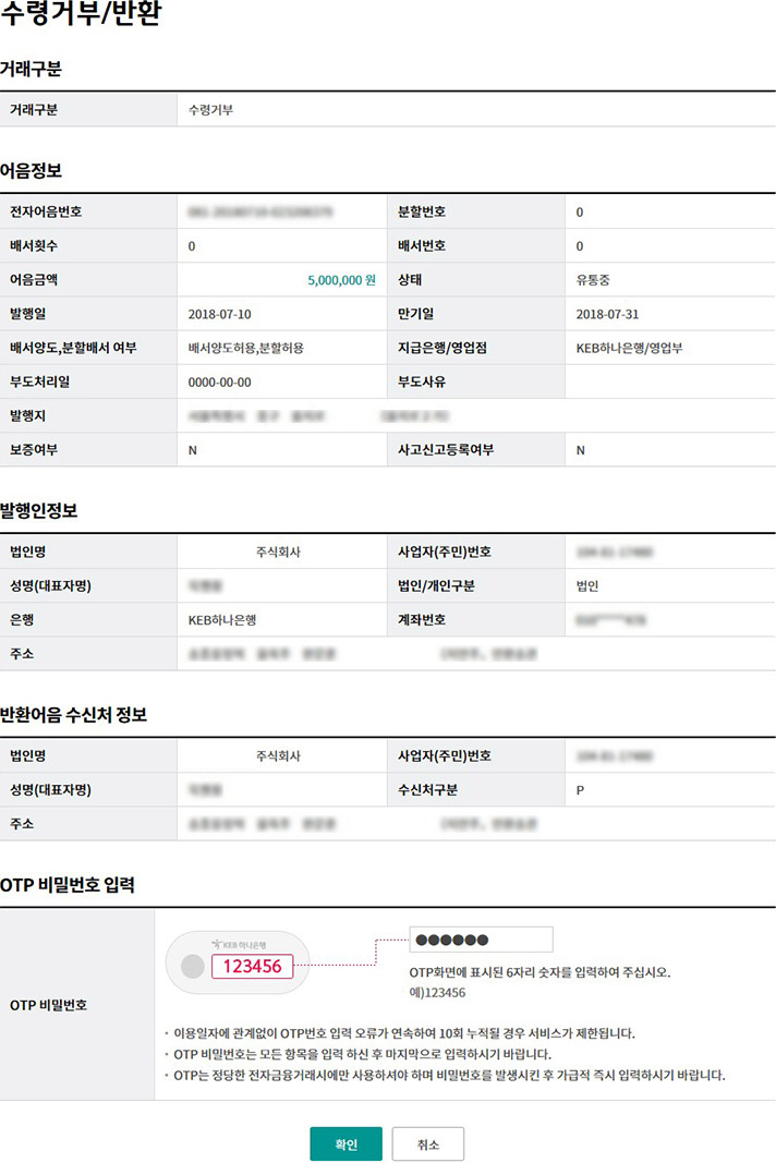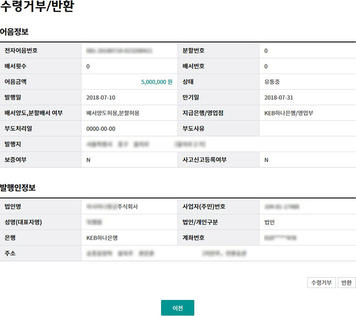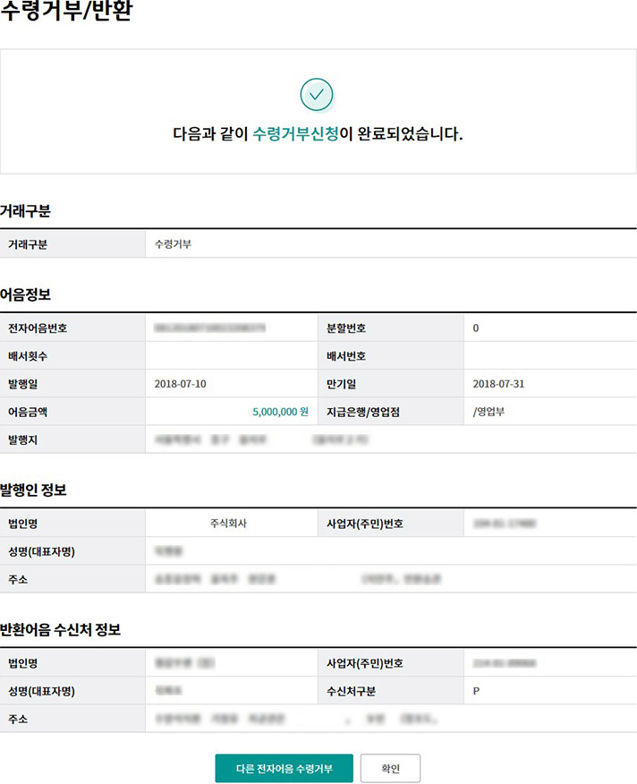 Step 3. 대상 전자어음의 상세조회 내용을 확인한 후, 수령거부 버튼을 클릭합니다.