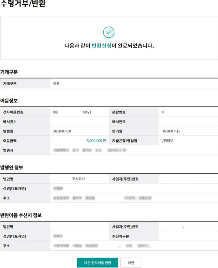 Step 6. 대상 전자어음의 상세조회 내용을 확인한 후, 반환 버튼을 클릭합니다.
