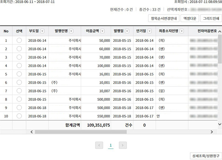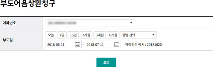 Step 1. 계좌번호, 부도일을 선택한 후 조회를 클릭합니다.