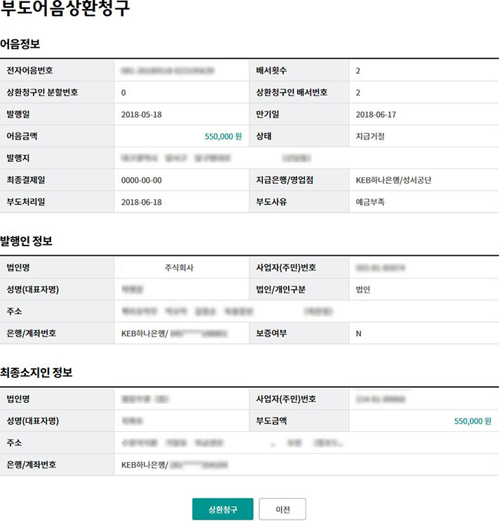 Step 3. 상환청구 대상어음 상세조회 내용을 확인하고, 상환청구 버튼을 클릭합니다.