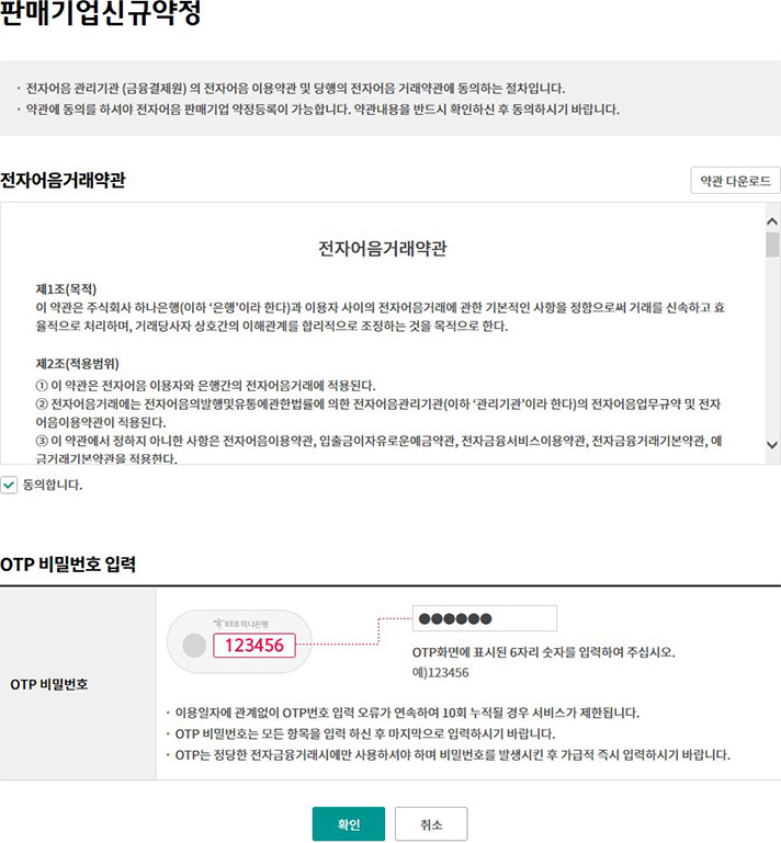 Step 2. 전자어음거래약관에 동의하고 OTP번호와 인증서 암호를 입력합니다.