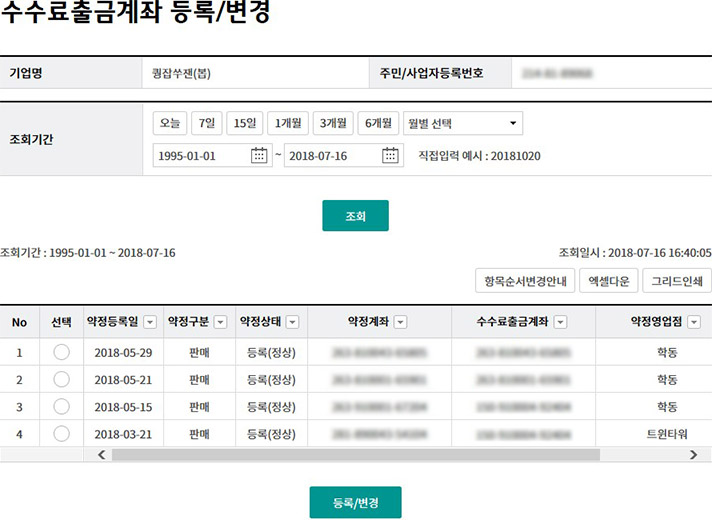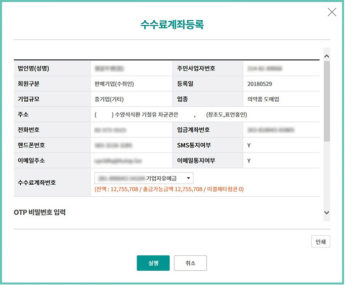 Step 2. 수수료 계좌를 선택 후 OTP번호와 인증서 암호를 입력하여 등록합니다.