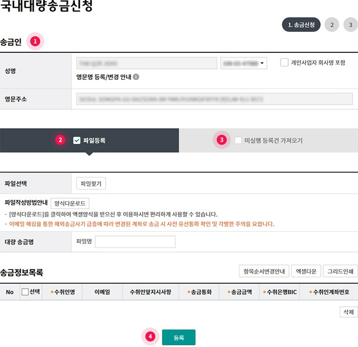 Step 1. 저장된 파일을 통해 국내대량송금신청이 가능합니다.
