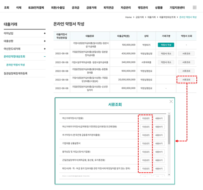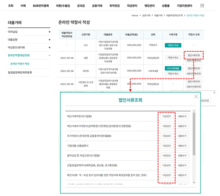 ① [법인서류조회] 버튼을 클릭하여 해당 약정서의 법인 서류를 확인 할 수 있습니다.