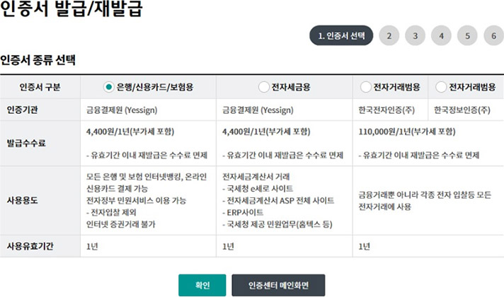 Step 2. 발급할 인증서 종류를 선택한 후 확인 버튼을 클릭합니다.