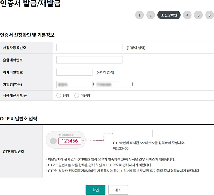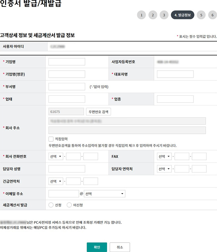 Step 5. 고객상세 정보 및 세금계산서발급정보(개인사업자 경우)를 입력한 후 확인 버튼을 클릭합니다.