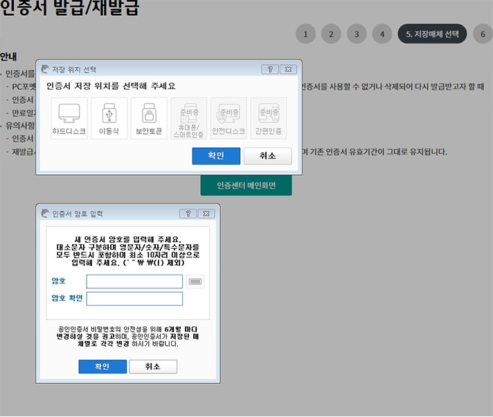 Step 6. 인증서 저장 위치 선택 후 확인 버튼을 클릭하고, 인증서 암호 입력 후 확인버튼을 클릭합니다.