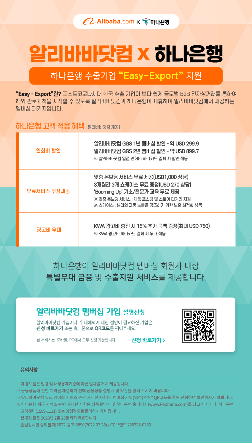 “Easy - Export”란? 포스트코로나시대 한국 수출 기업이 보다 쉽게 글로벌 B2B 전자상거래를 통하여 해외 판로개척을 시작할 수 있도록 알리바바닷컴과 하나은행이 제휴하여 알리바바닷컴에서 제공하는 멤버십 패키지입니다.