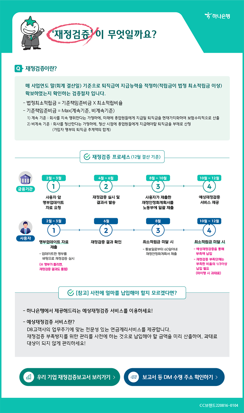 매 사업연도 말(회계 결산일)기준으로 퇴직급여 지급능력을 적정히(적립금이 법정 최소적립금 이상) 확보하였는지 확인하는 검증절차 입니다.