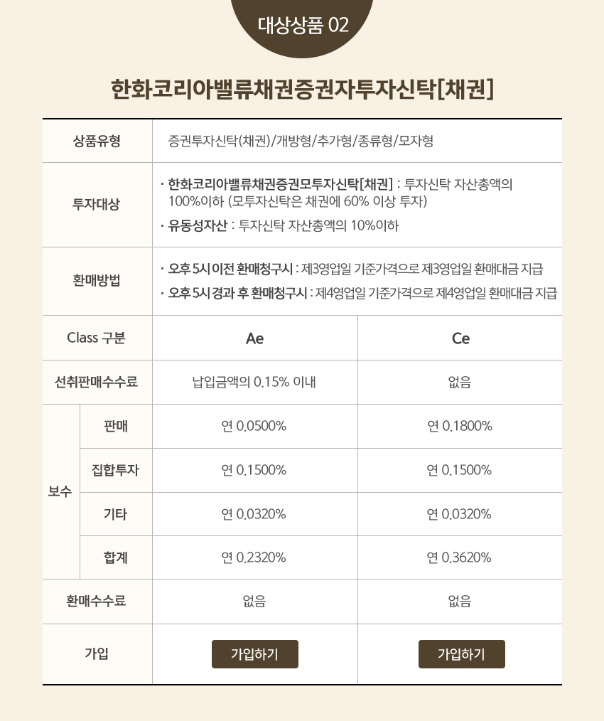 투자대상 한화코리아밸류채권증권모투자신탁[채권] : 투자신탁 자산총액의 100%이하 (모투자신탁은 채권에 60% 이상 투자)