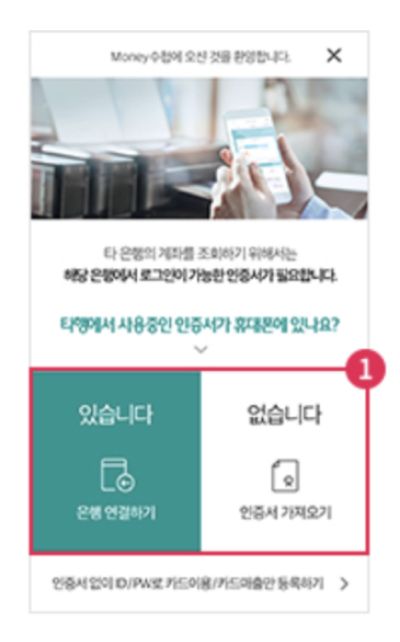 • 다른은행 계좌를 조회하기 위해서는 해당 은행에 로그인 가능한 인증서가 스마트폰에 있어야 합니다.