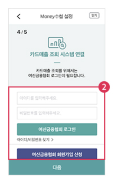 • 카드매출정보 조회를 위해서는 여신금융협회 아이디/비밀번호가 필요합니다. (Money수첩에서 바로 가입 가능)